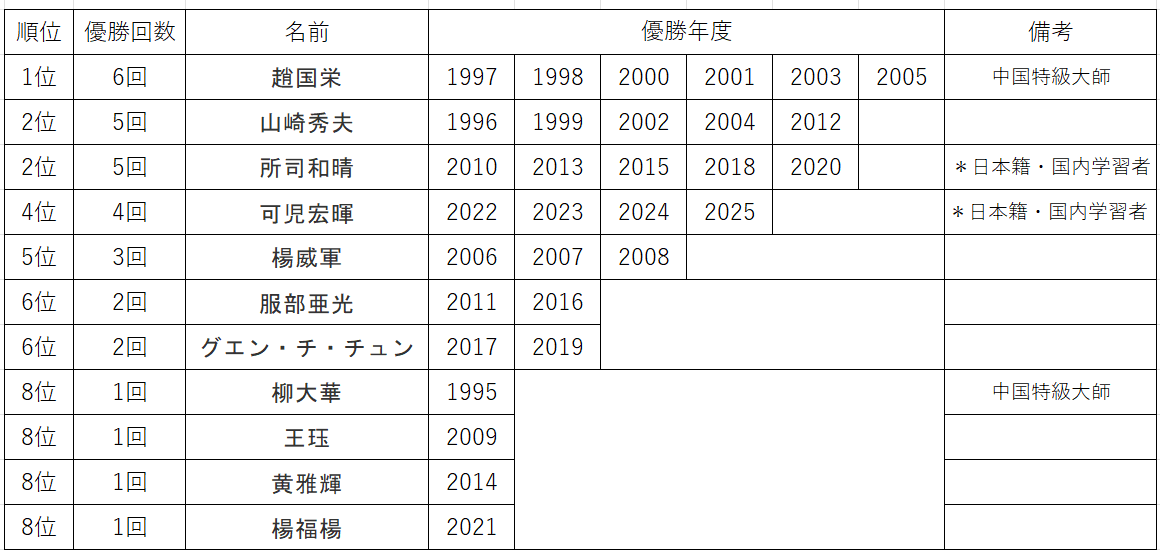 *ランキングは「全国選抜トーナメント」「日本オープン」の優勝回数を集計しています。